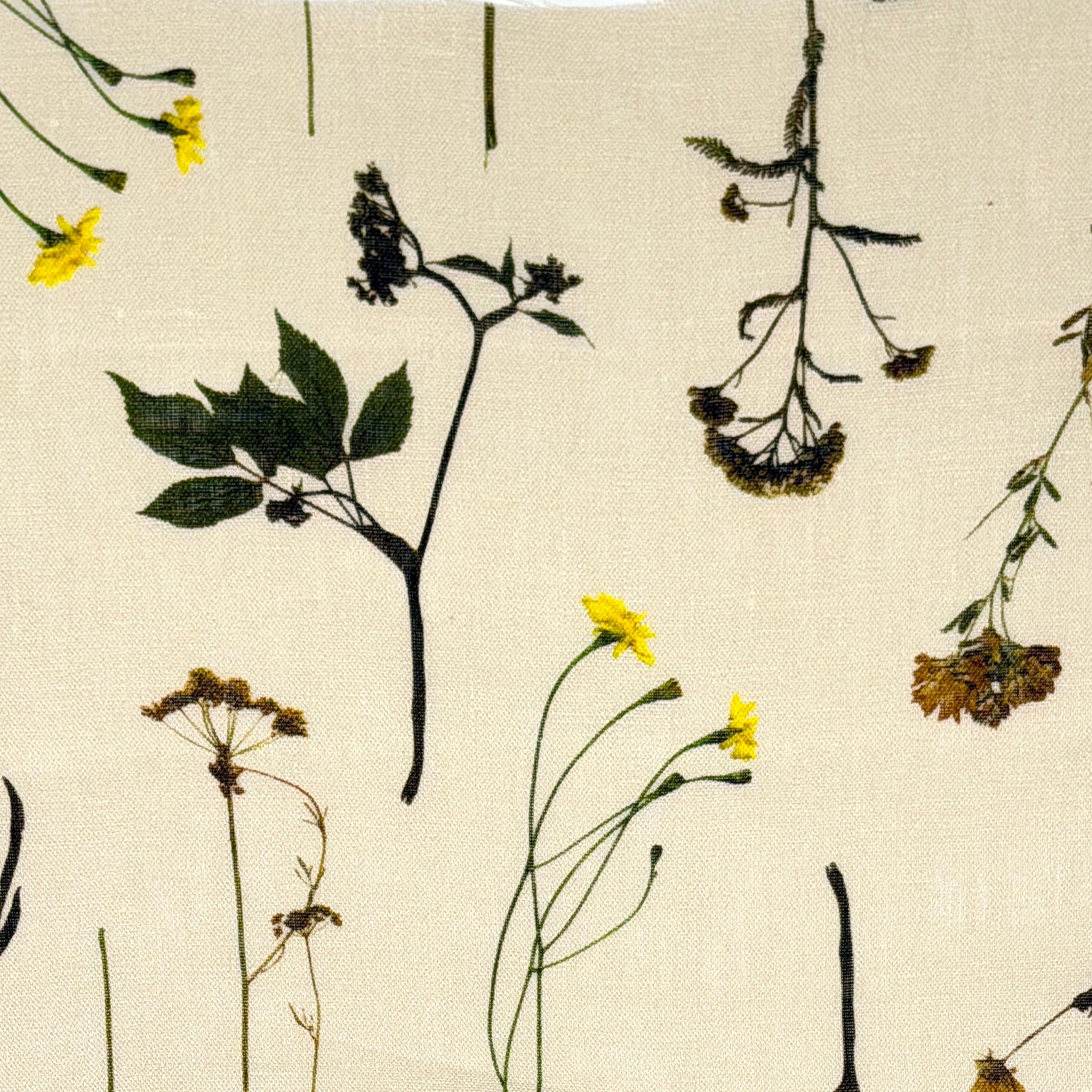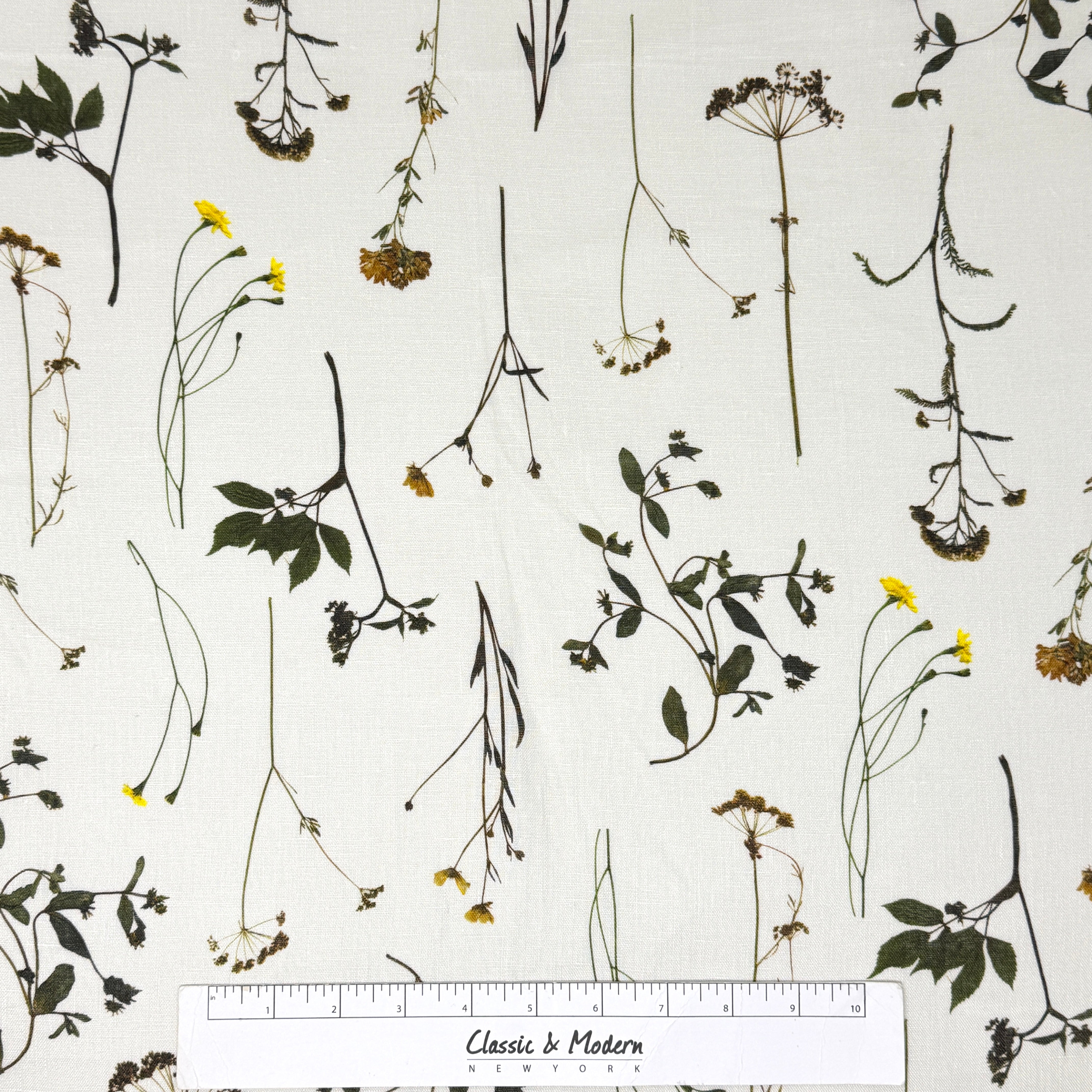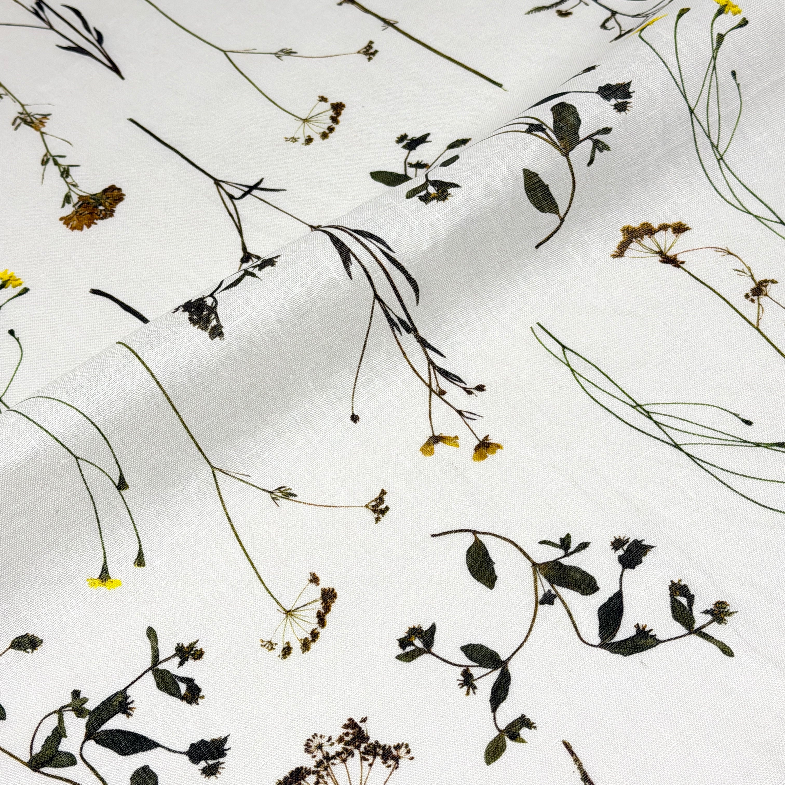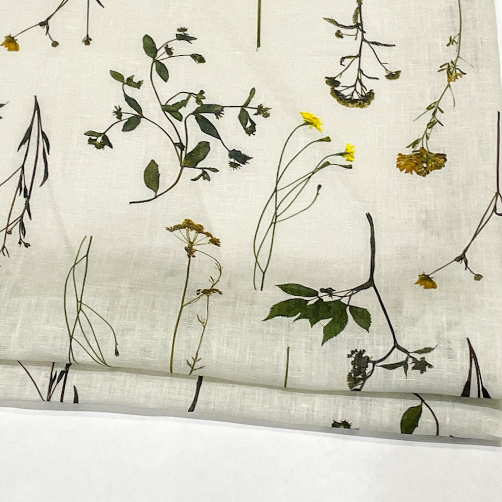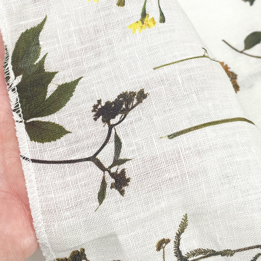 Lightweight linen fabric featuring a botanical garden print with delicate blooming plants and wildflowers.