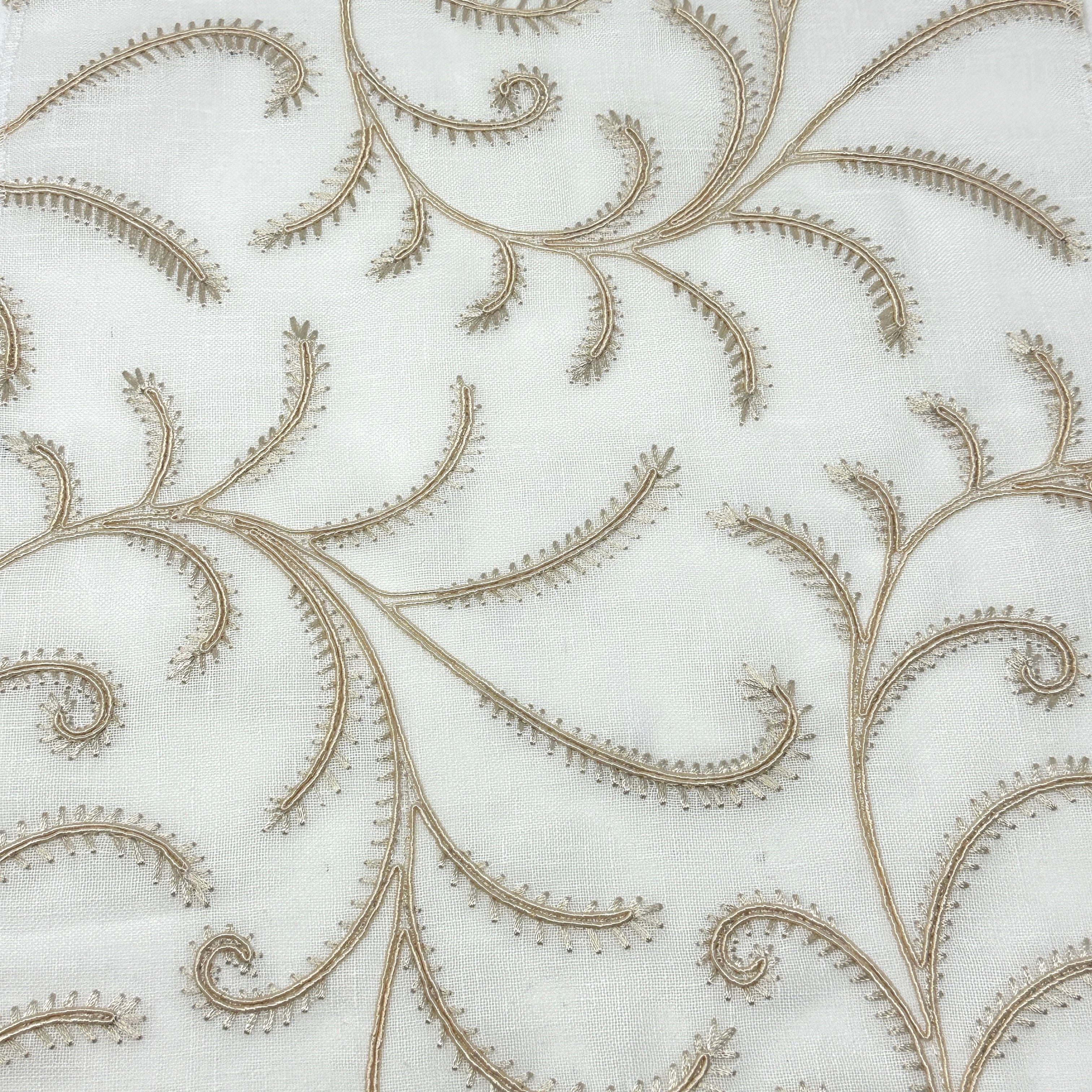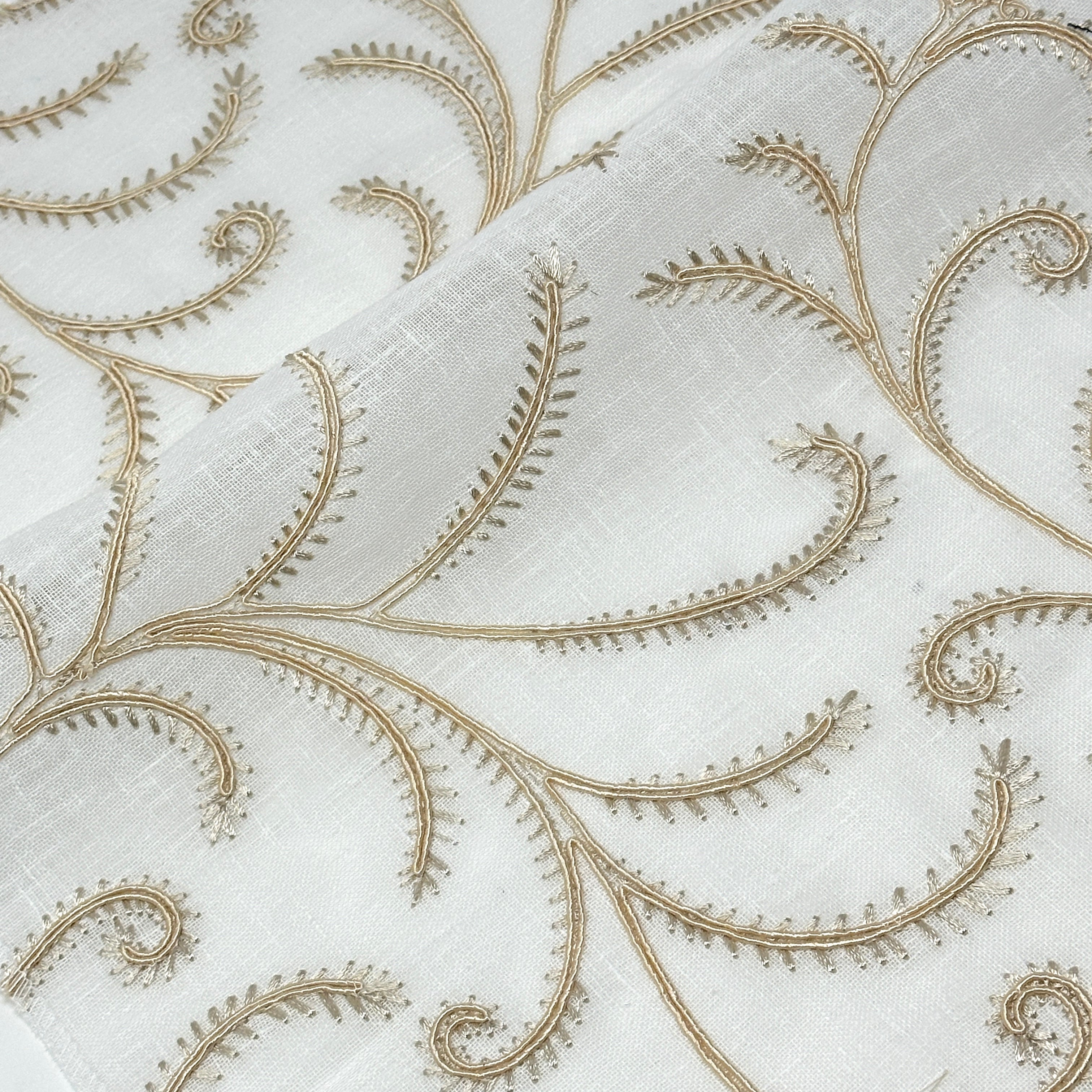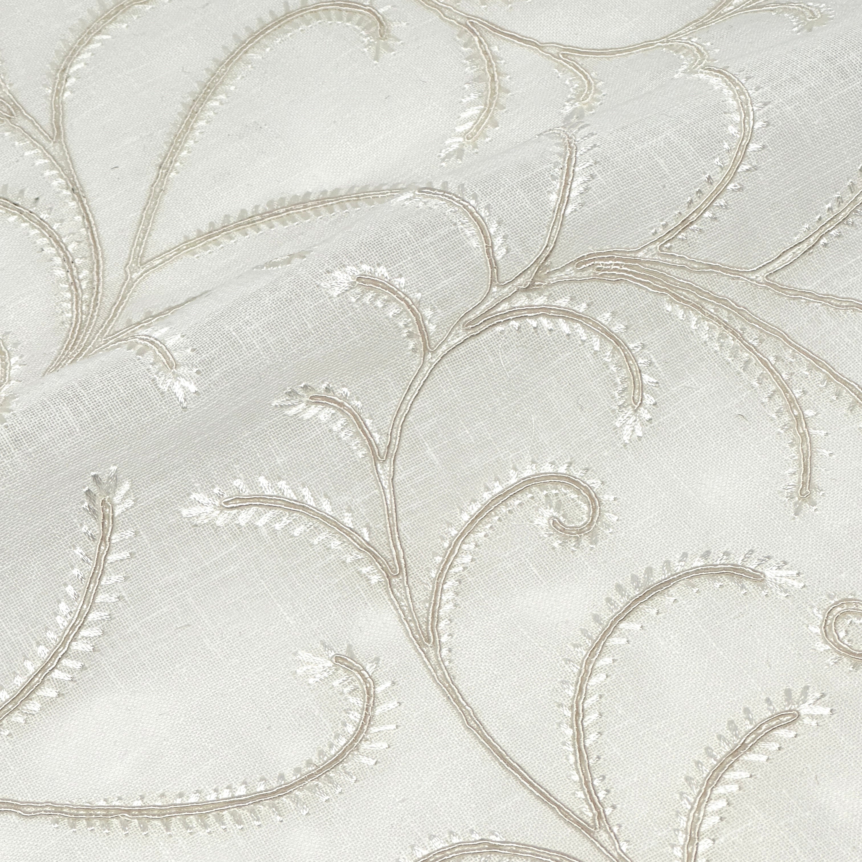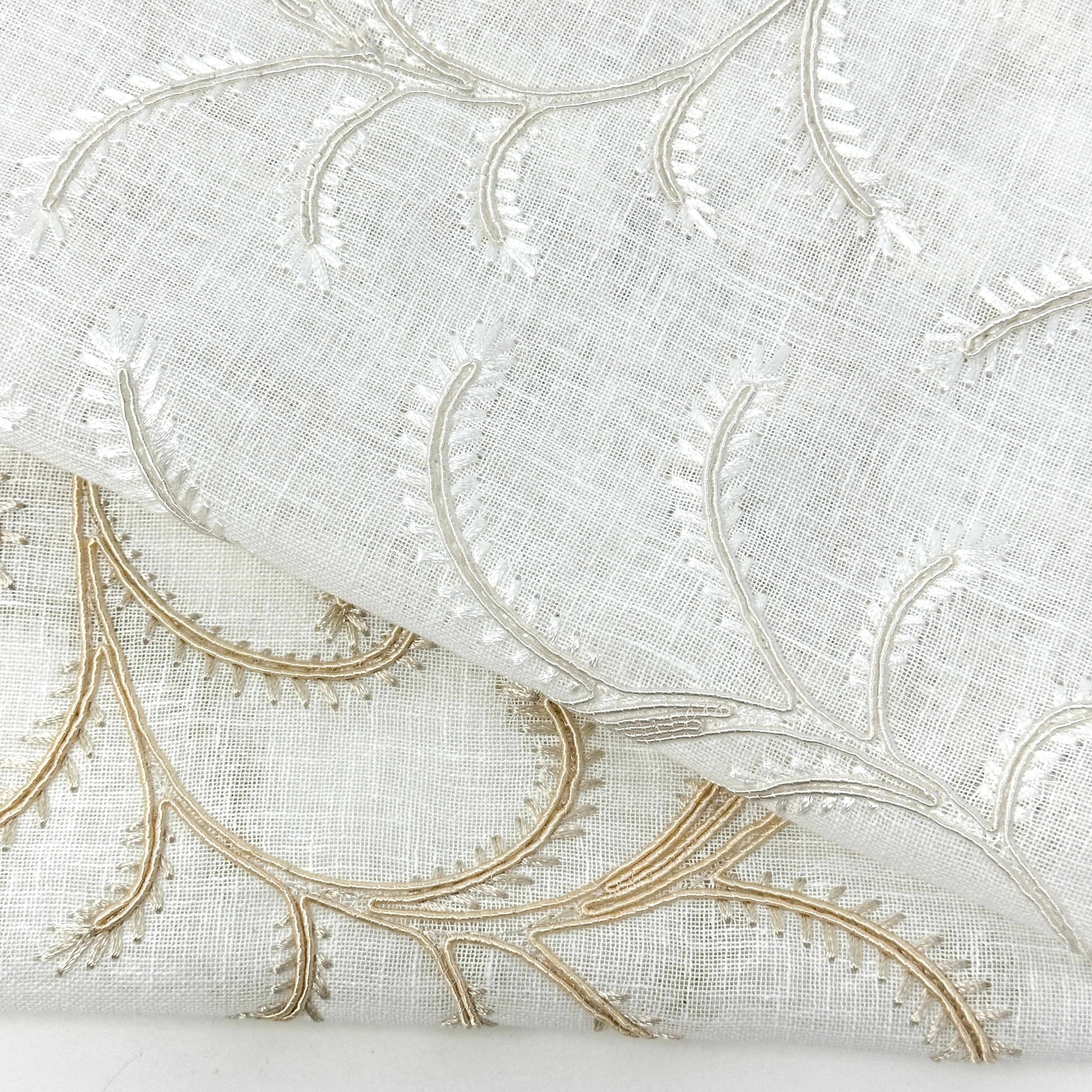 Delicate and airy, this linen blend sheer fabric features elegant leaf embroidery in soft tones.