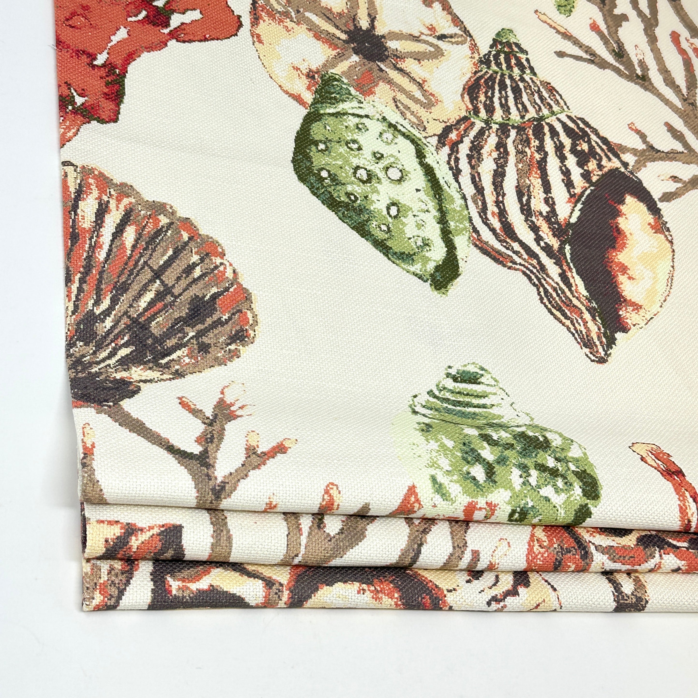 Coastal-themed linen fabric with vibrant coral, shells, and sea elements. Perfect for drapery, cushions, and beach-style décor.
