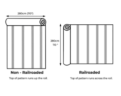 ***railroaded fabric-the pattern or stripe runs across the roll, perpendicular to the selvage.