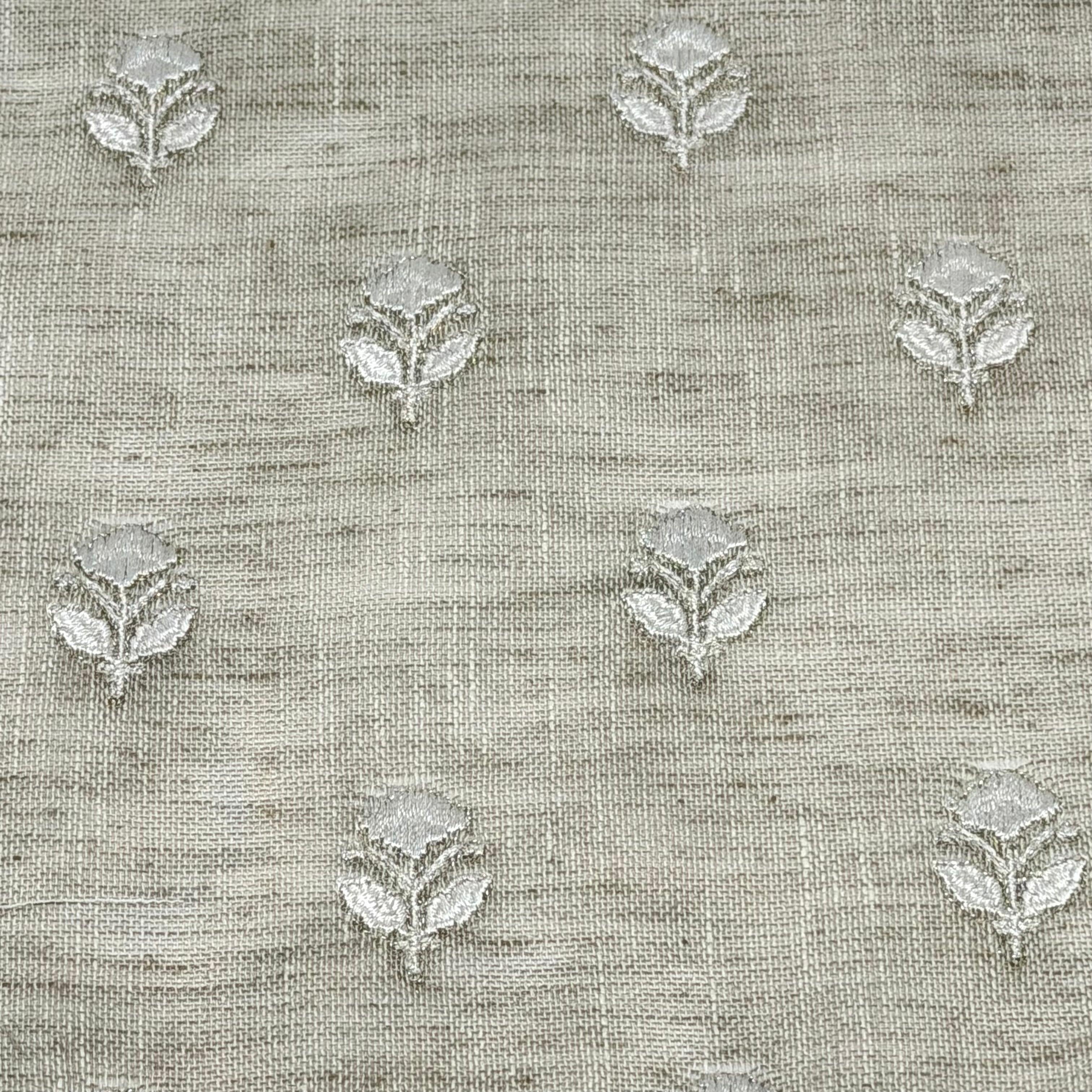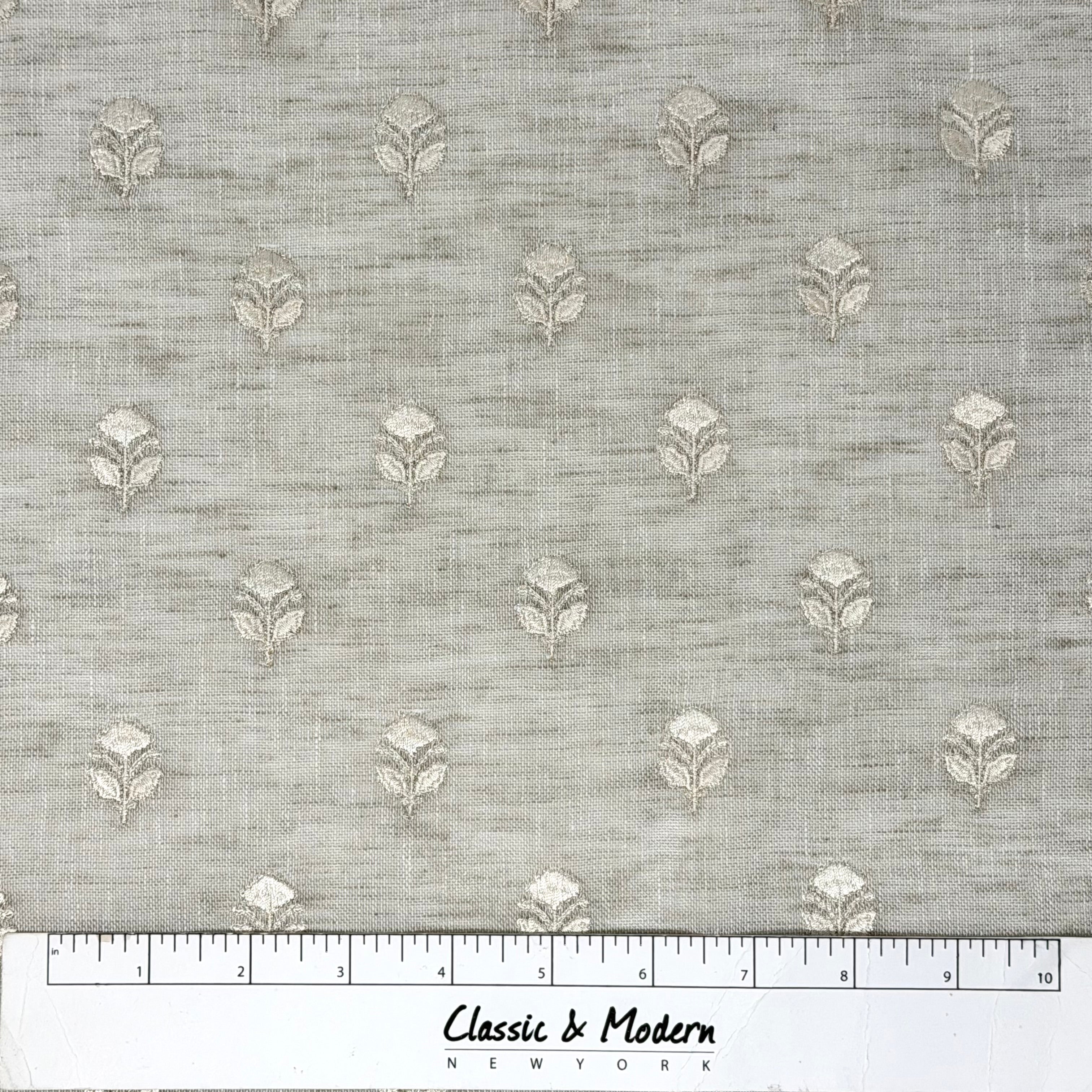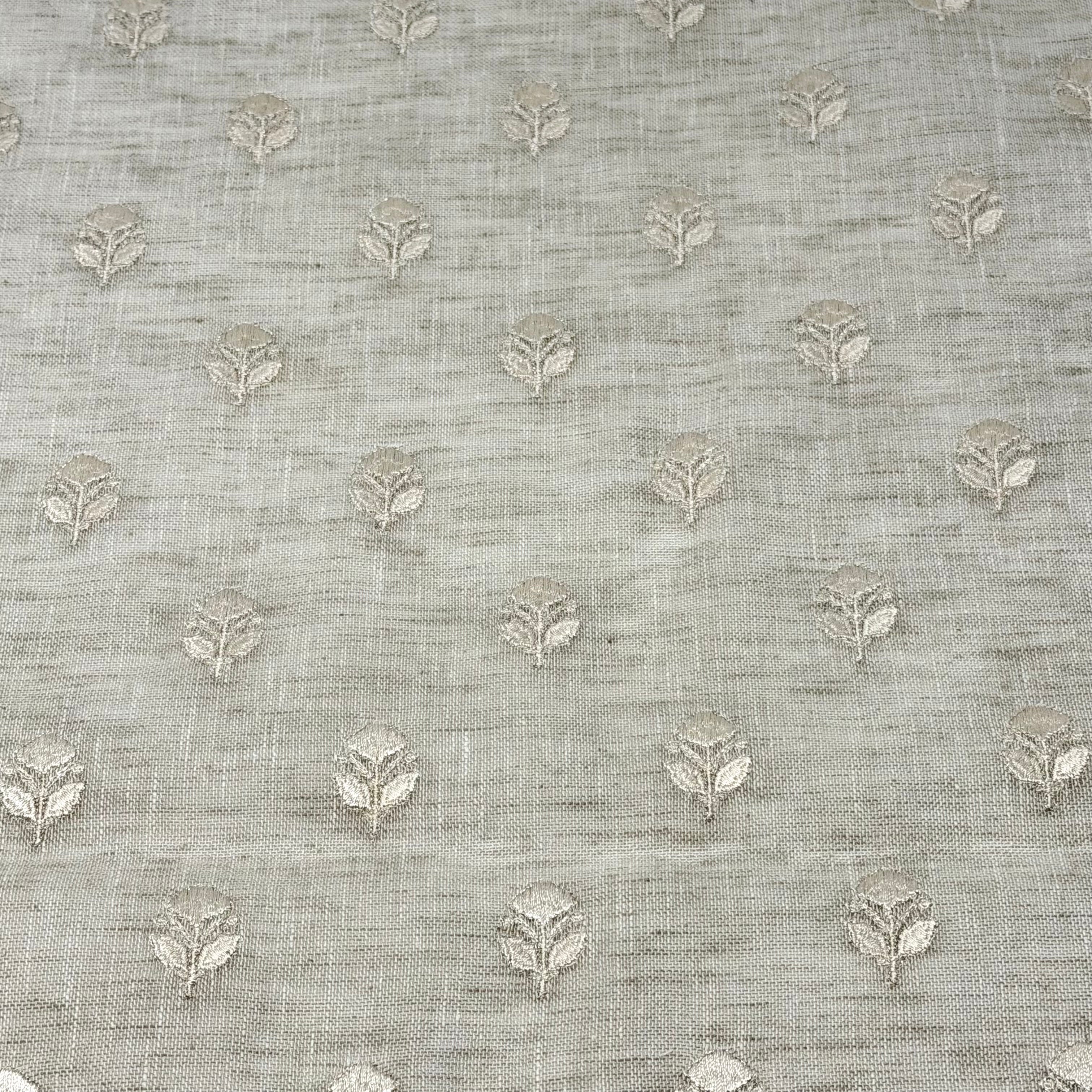 Delicate and airy, this linen blend sheer fabric features elegant floral embroidery in soft tones.