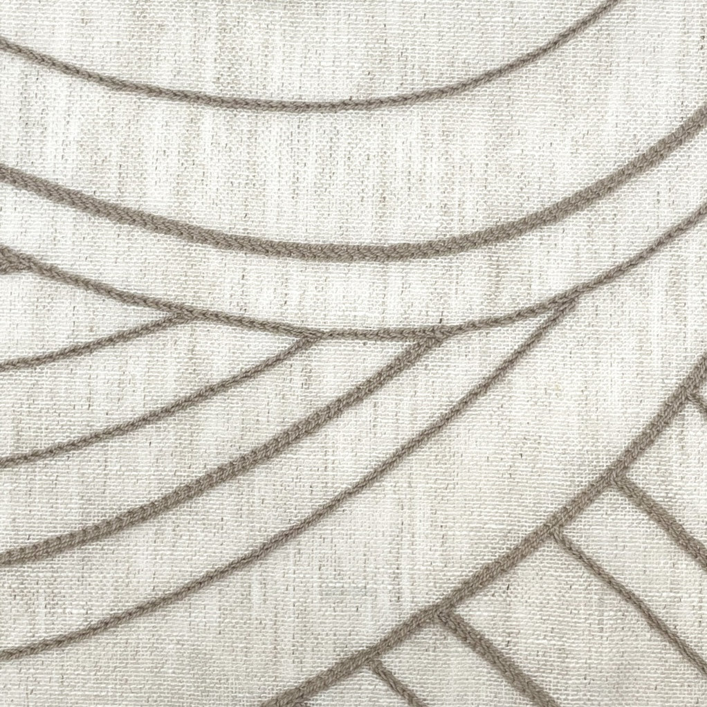 Elegant sheer linen blend fabric featuring wave-inspired geometric embroidery in neutral tones.