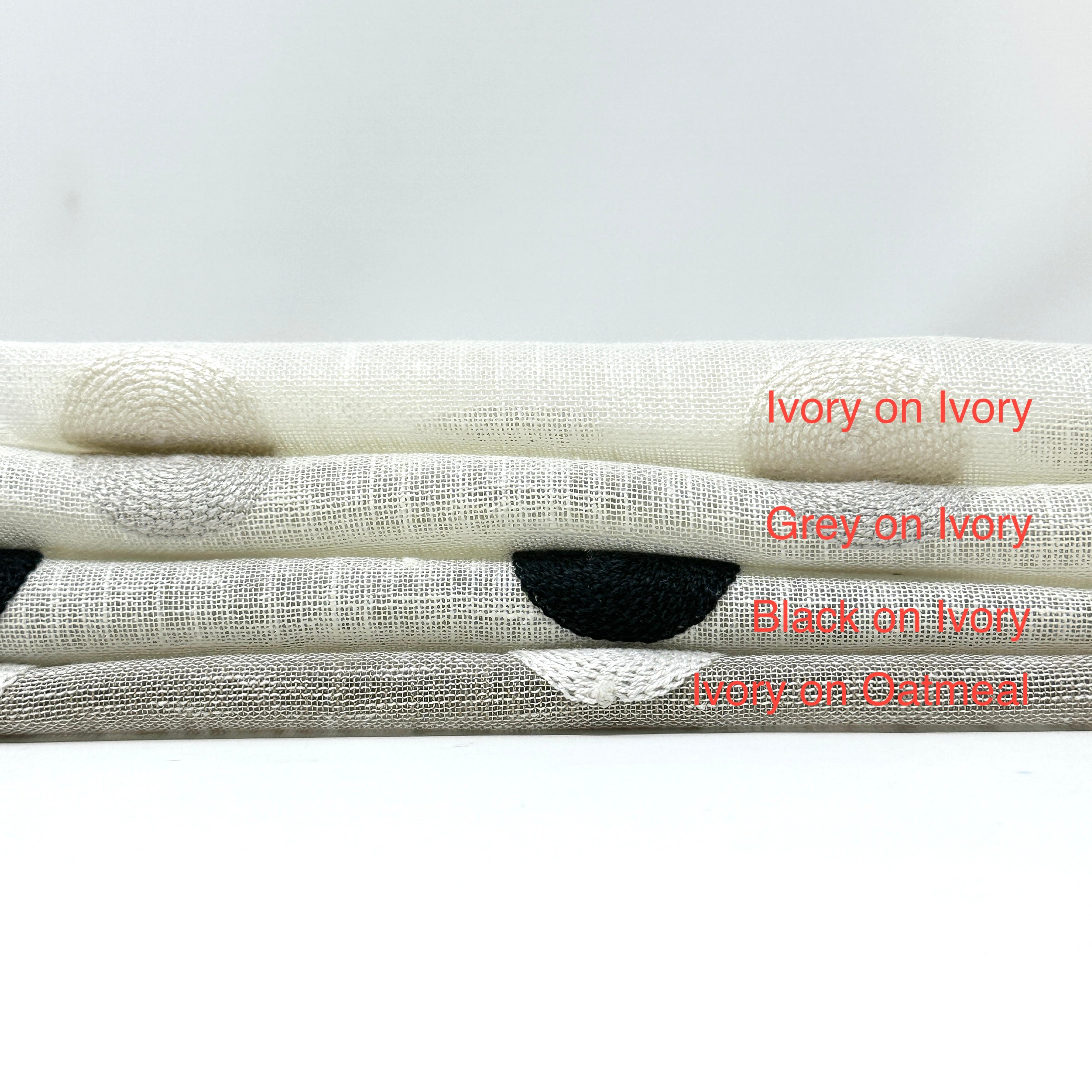 A playful and modern linen fabric featuring bold black embroidered circles on a soft white background. Contents: 75% Poly/21% Linen/4% VisWeight: Light weightWidth: 54"Type: SheerUsage: Home Decor, Drapery, Curtain, Table Top 💥 All fabrics are carefully prepared based on your...