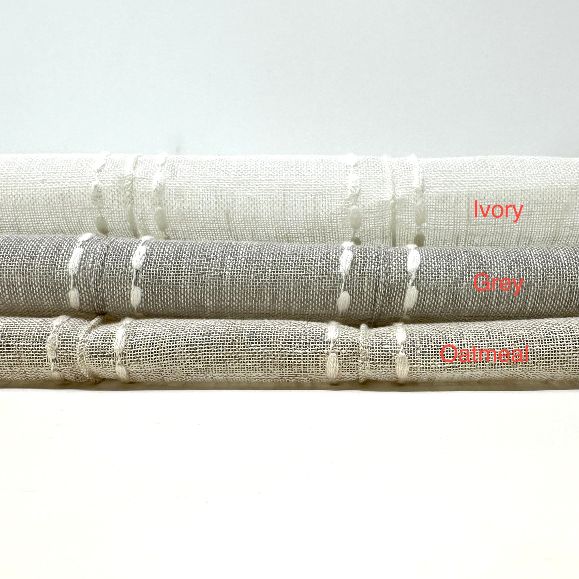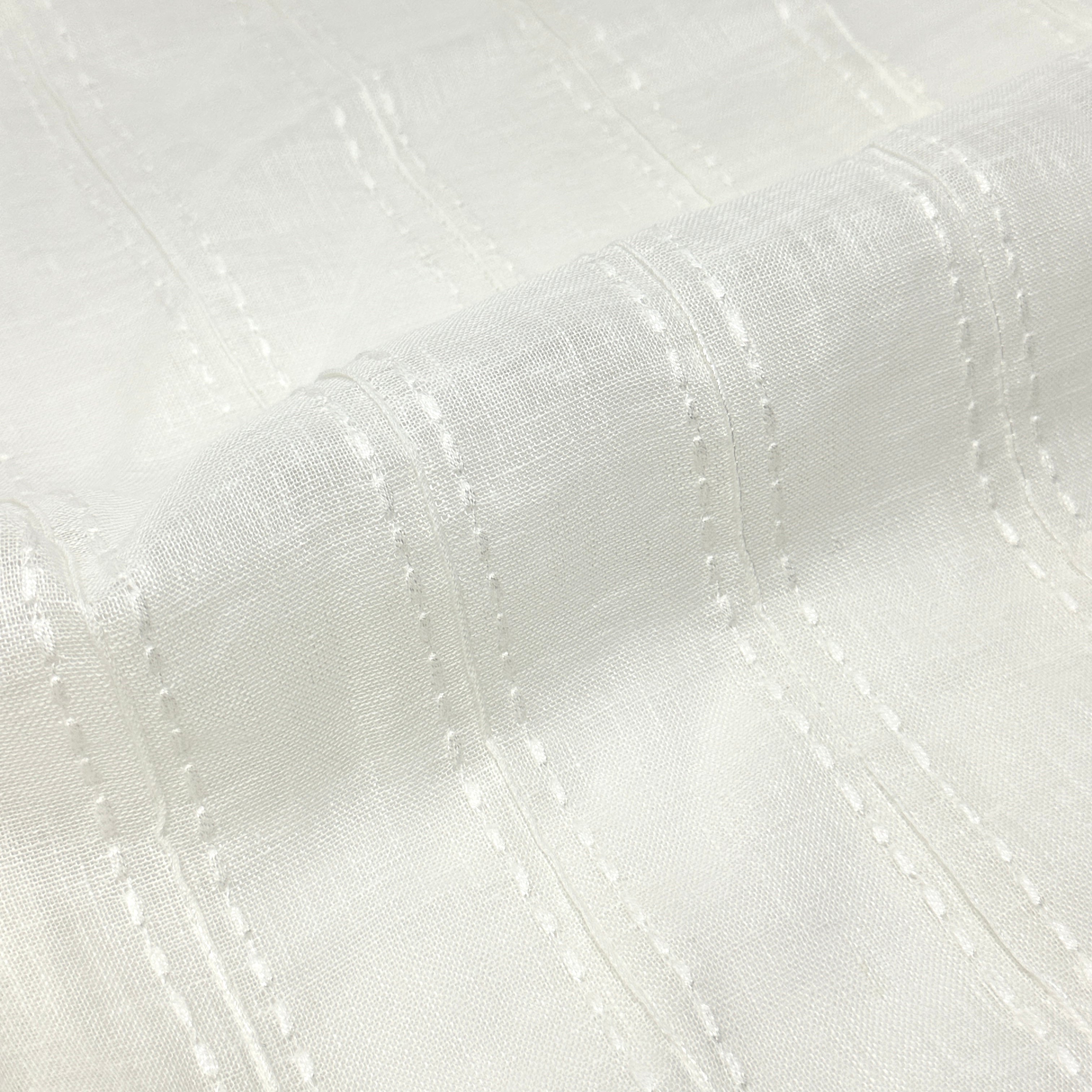 Elegant sheer linen fabric featuring embroidered dots and textured stripes fabric by the yard.