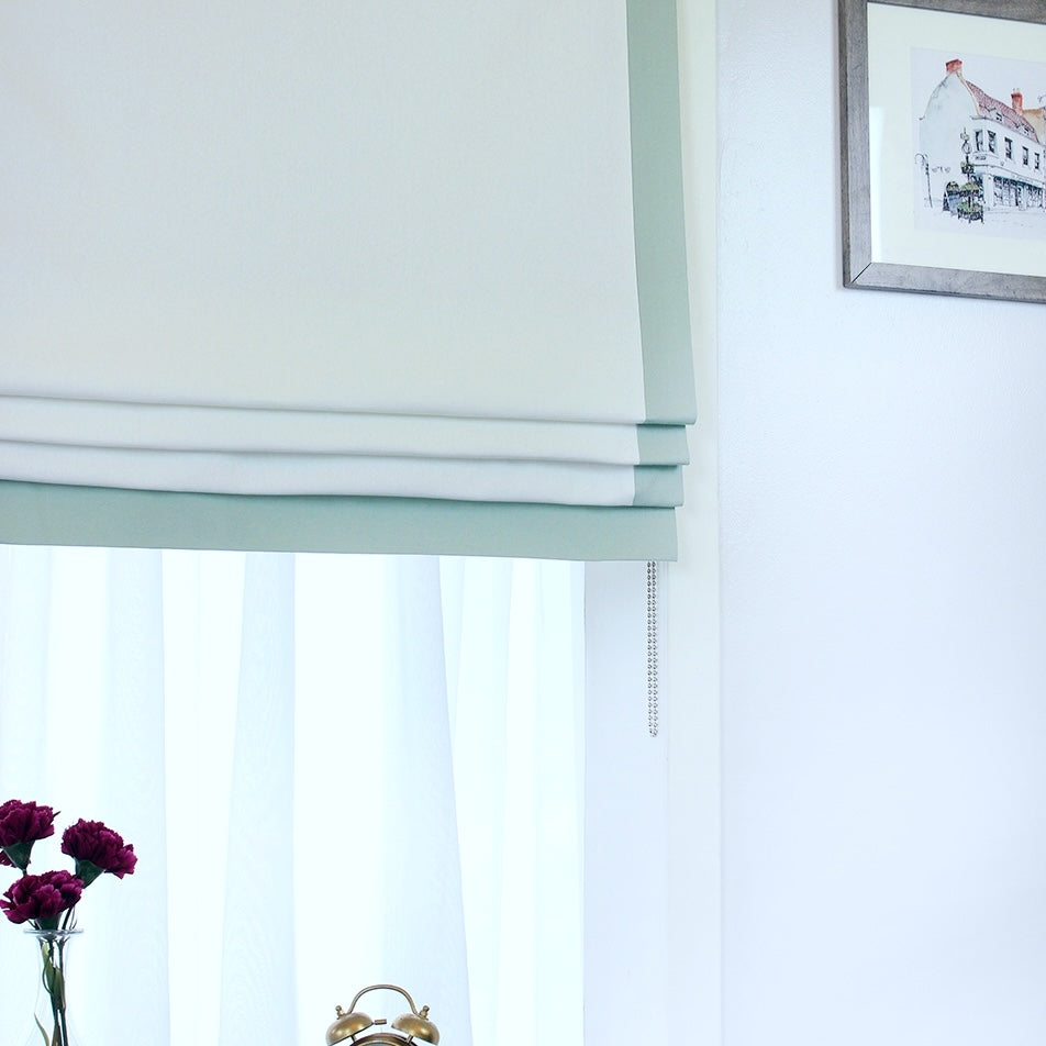 White Flat Roman Shades with Mint Trim/CL1010