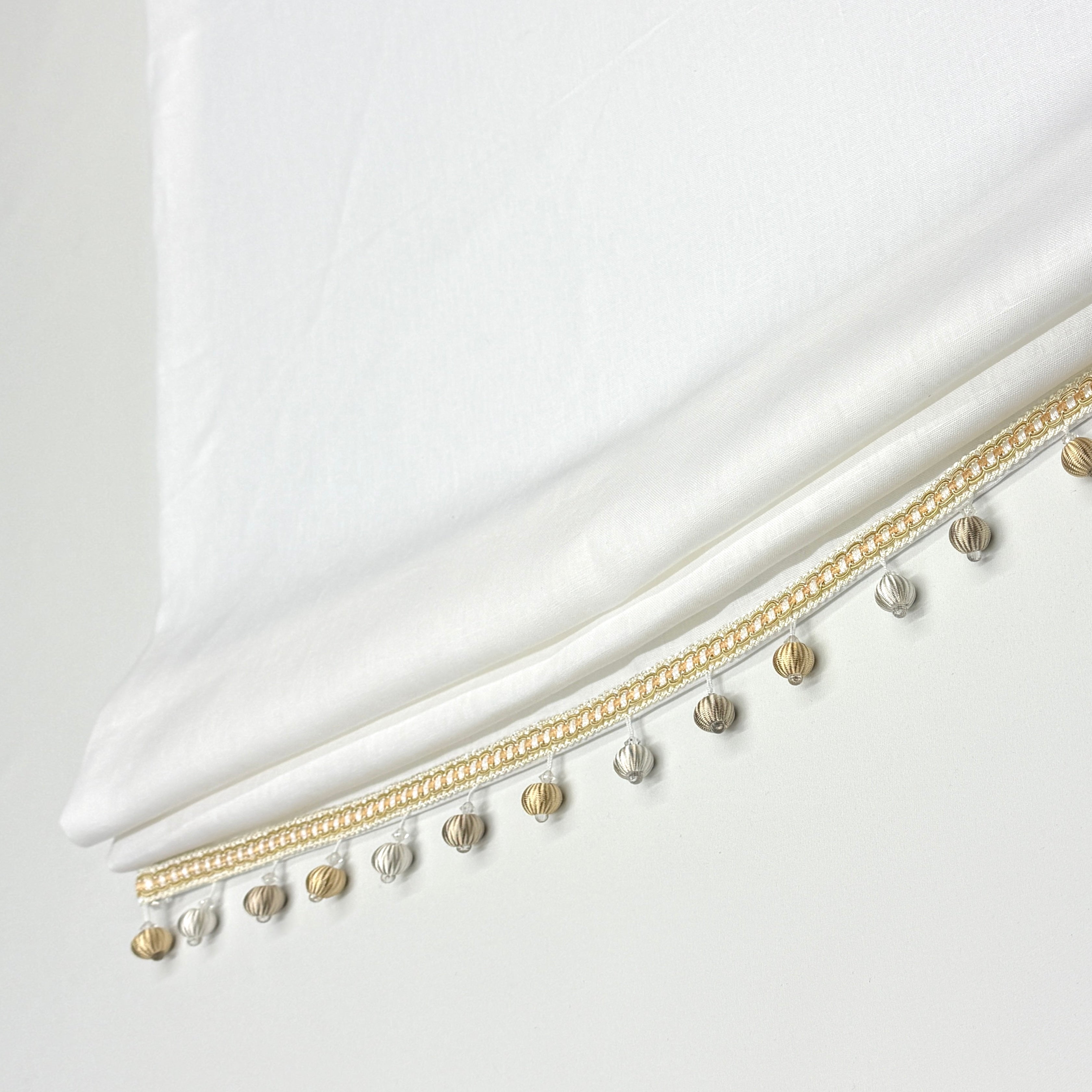 White Linen Relaxed Roman Shade with Multi Color Beaded Trim, Blackout option, CL1010