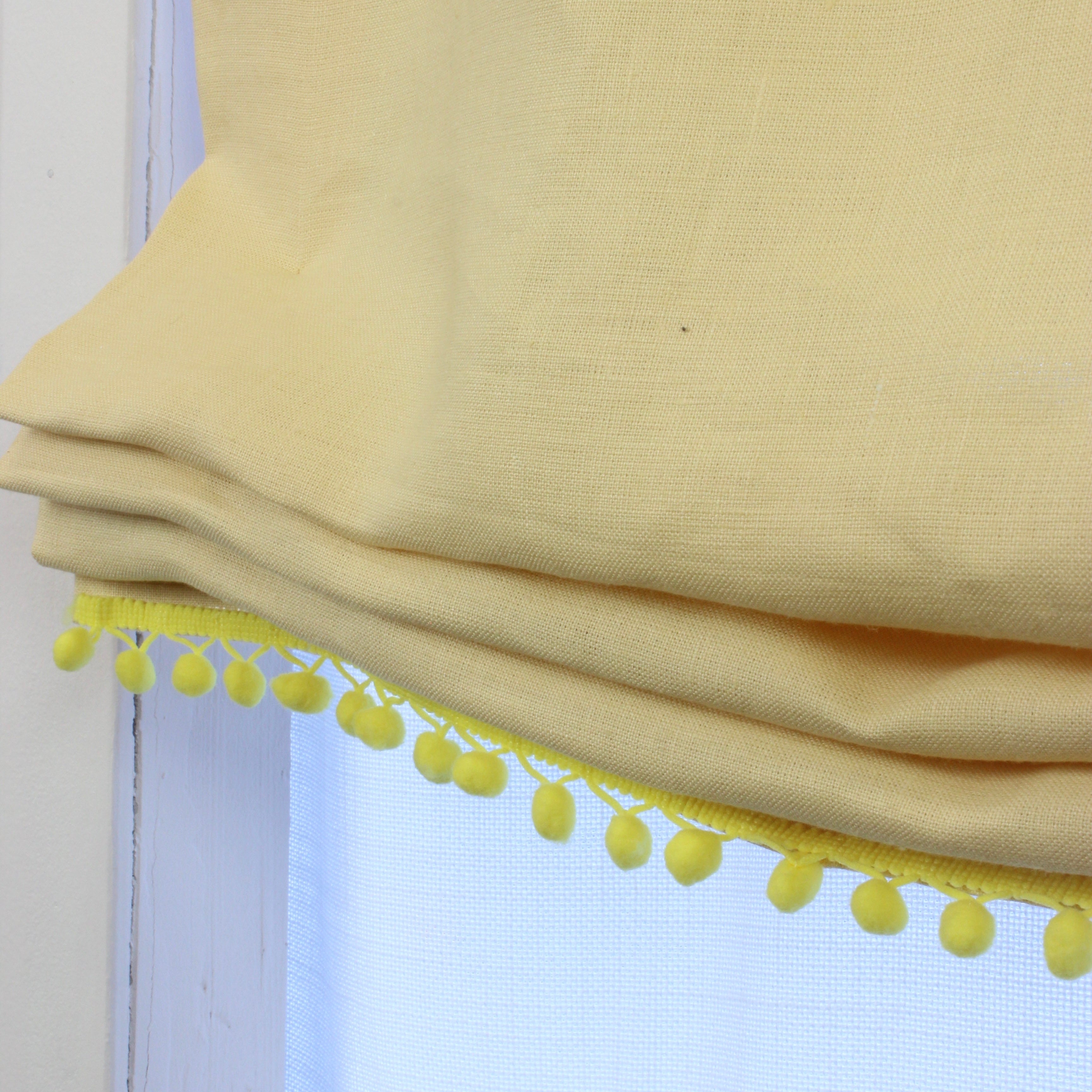 Yellow Linen Relaxed Roman Shade with Yellow Pom Pom, Blackout option/CL1010
